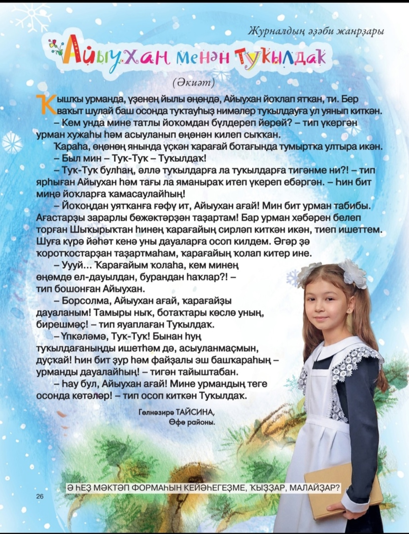 Һәм Гөлнәзирә Тайсина журналға "Айыухан менән Туҡылдаҡ" тигән әкиәт яҙып та бирҙе. Кемдәр хаҡында икән ул? Үҙегеҙ уҡып белерһегеҙ